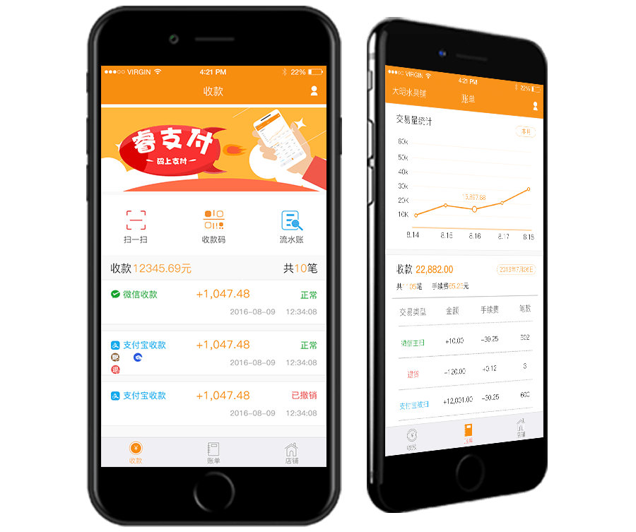 移動端收款app,支持商(shāng)戶注冊、店(diàn)員體(tǐ)系、多(duō)通道掃碼、交易查詢、賬單統計、卡券核銷等功能(néng)。